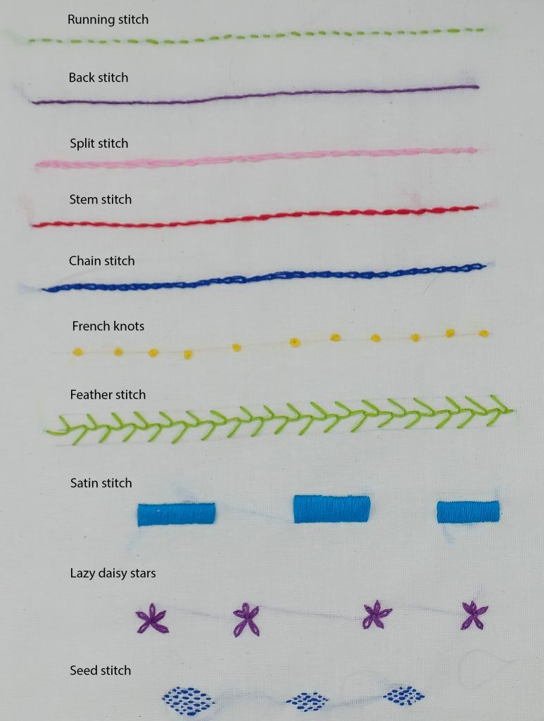 Muestrario con puntadas en tela sin cuenta.