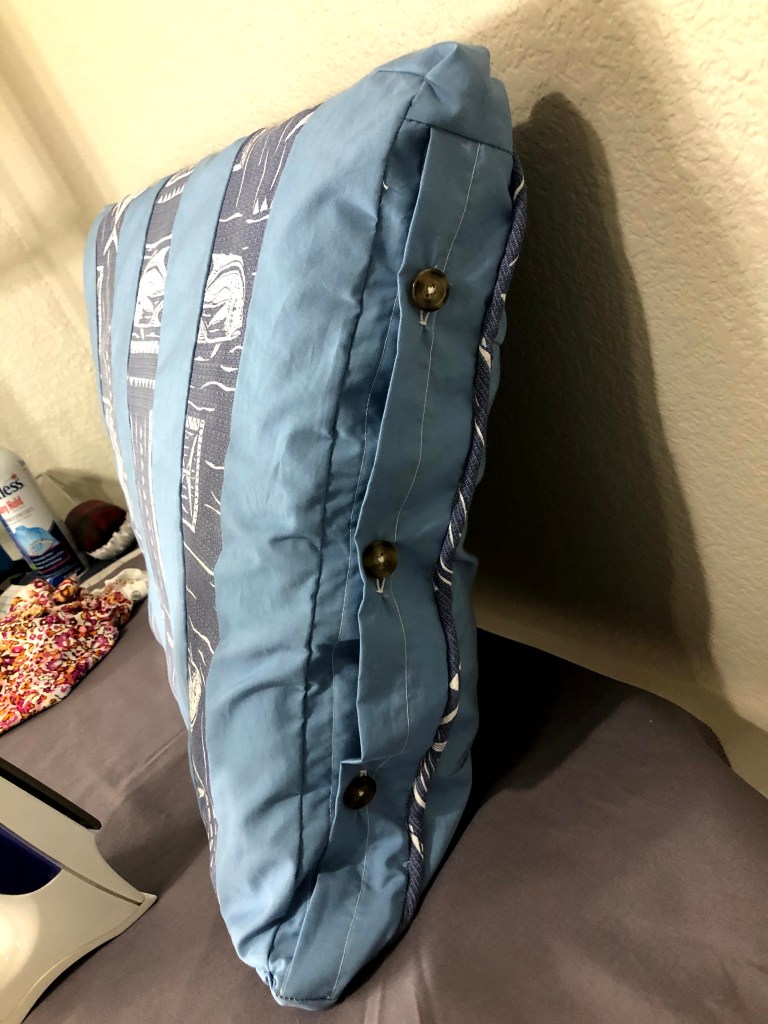 Once the embroidery was finished, I used an old shirt and a left over piece from a bed cover to make the rest of the cushion cover. I even made piping! I originally wanted to put an invisible zipper but realized that it was too small for the cushion, so I ripped it out and put in buttons instead.