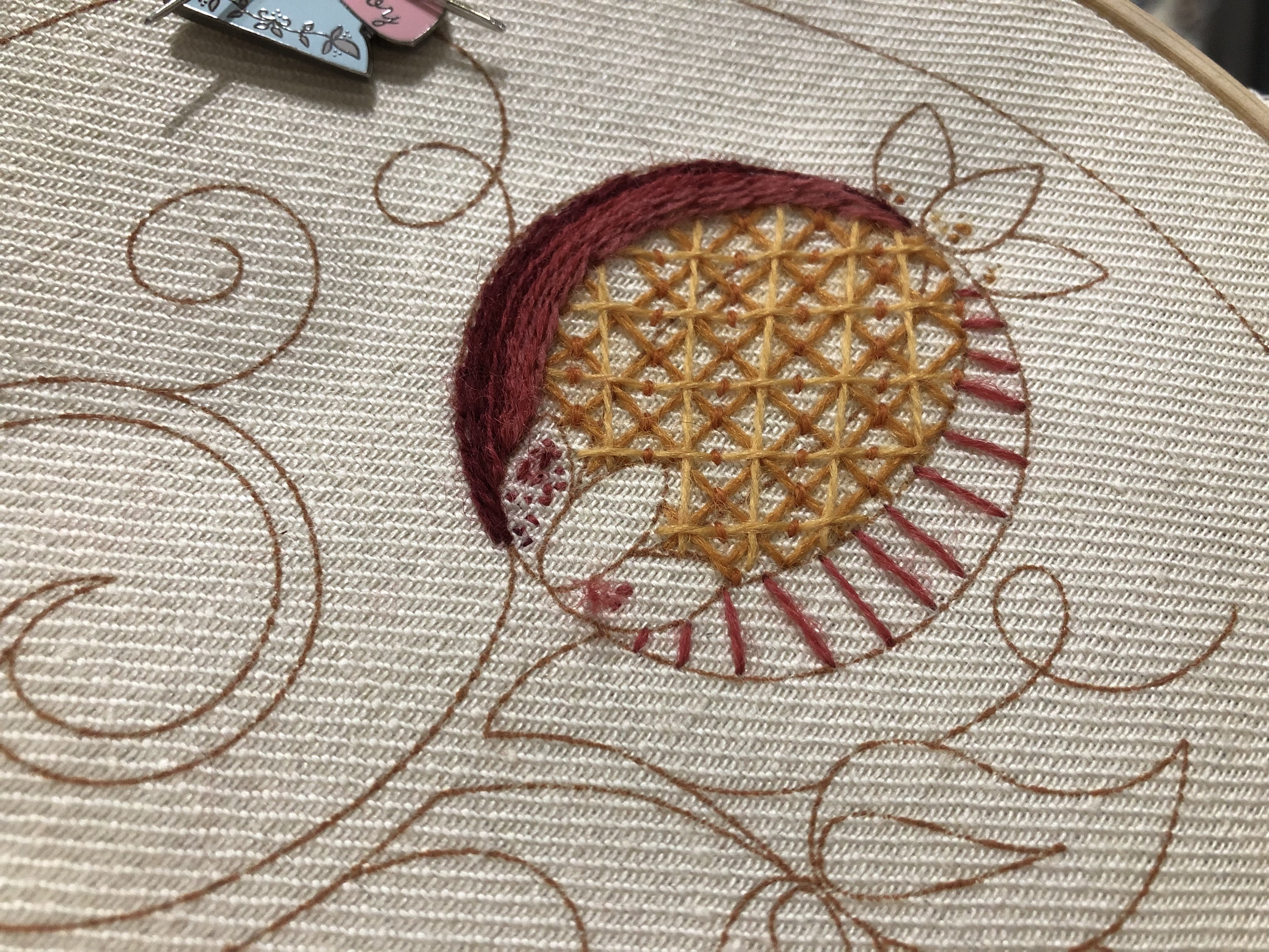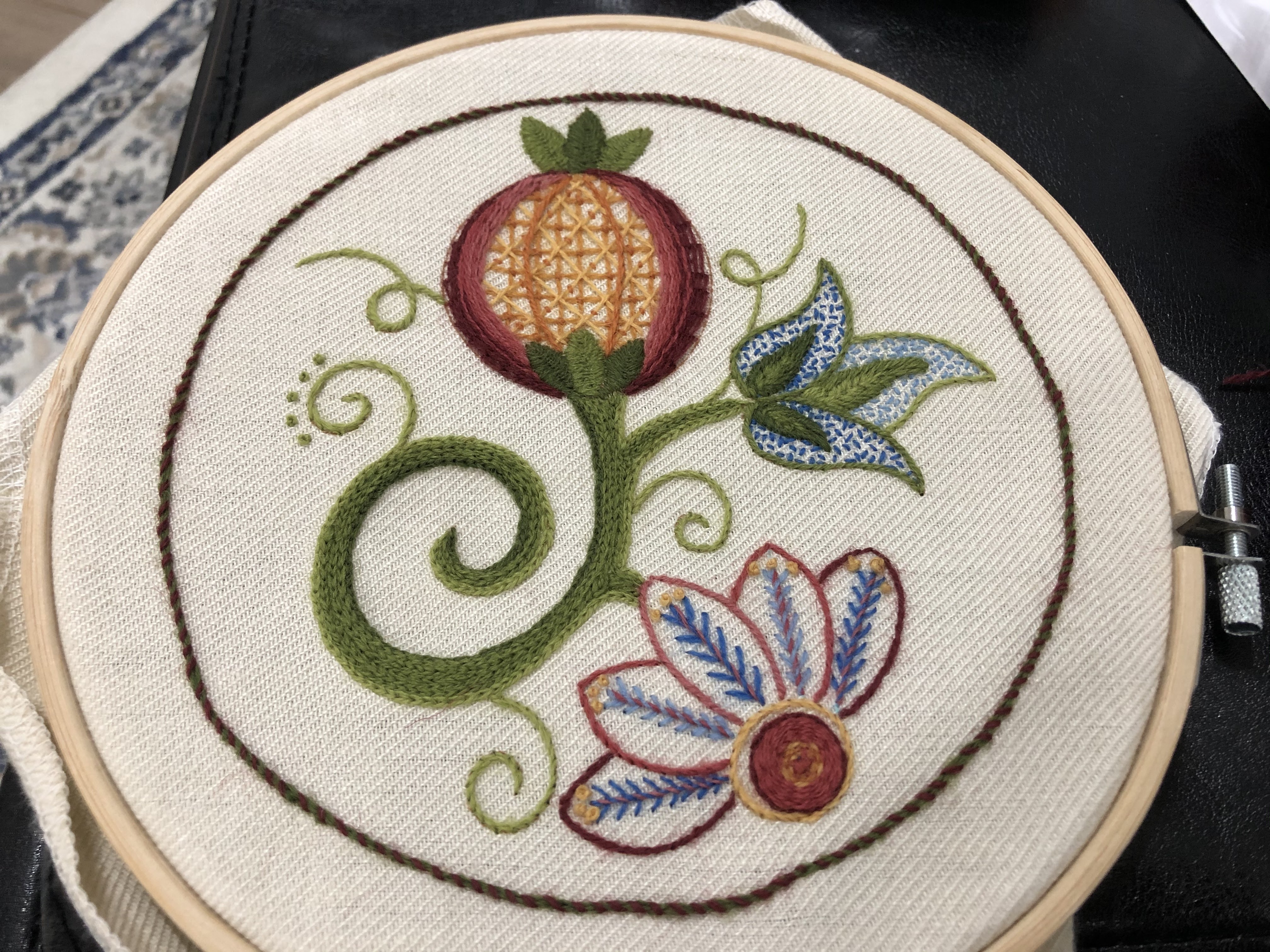 Other stitches that help cover large areas with minimal trips through the ground cloth are the trellis stitch (inside the pomegranate) and the woven wheel in the center of the petals to the lower right side.