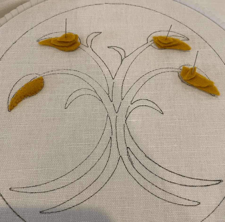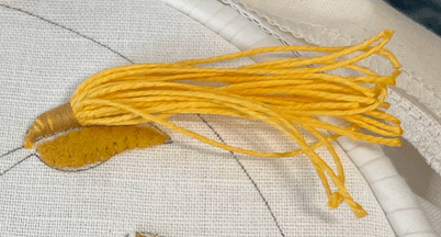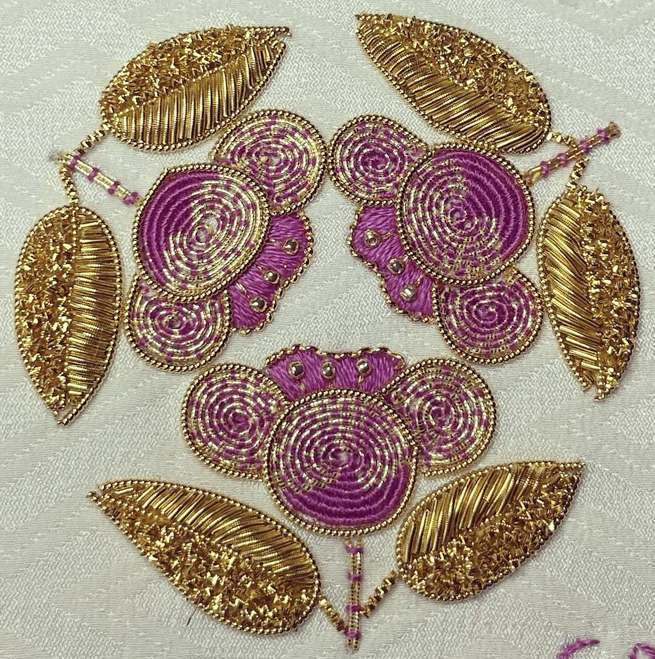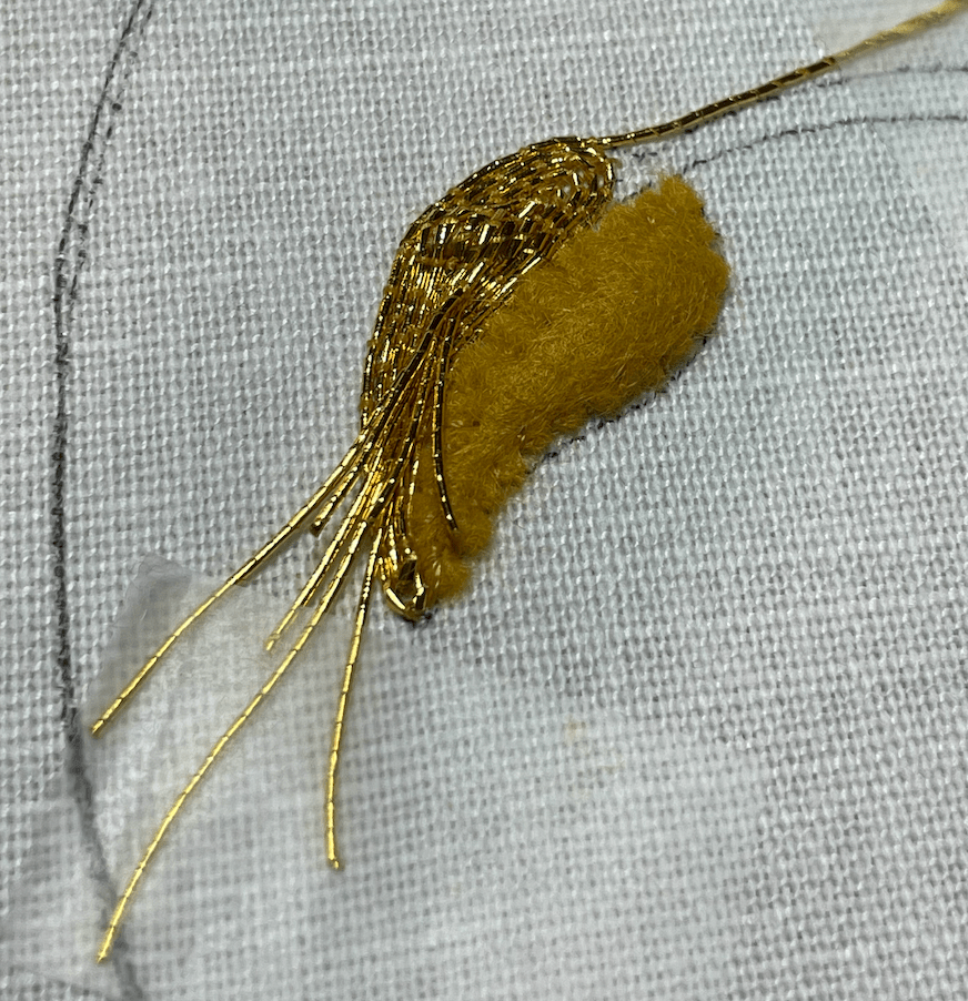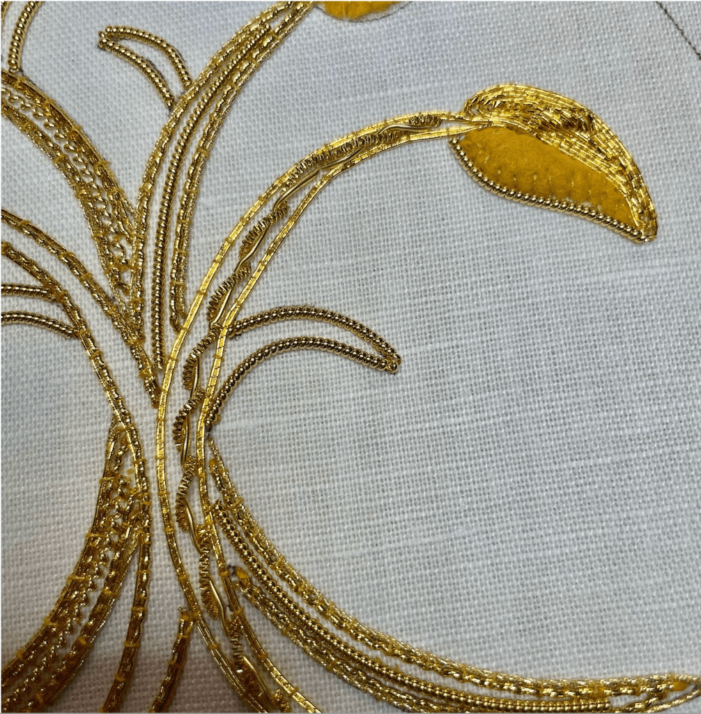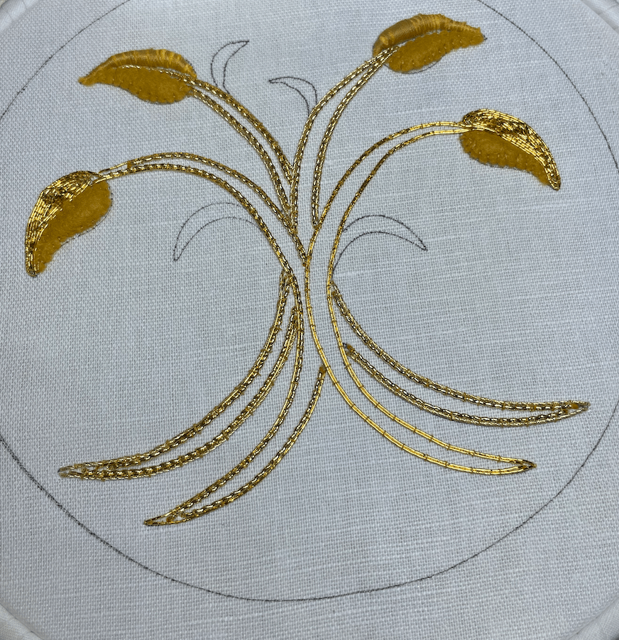 The project used Japanese and Rococo threads for the outlines of the stems and inside the leaves. The gold threads are couched onto the fabric using sewing thread.