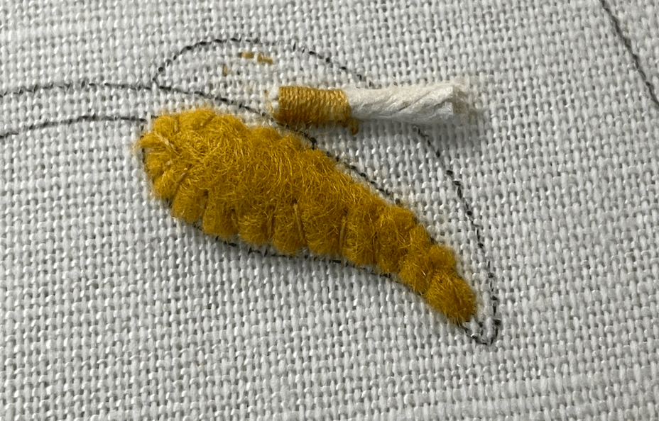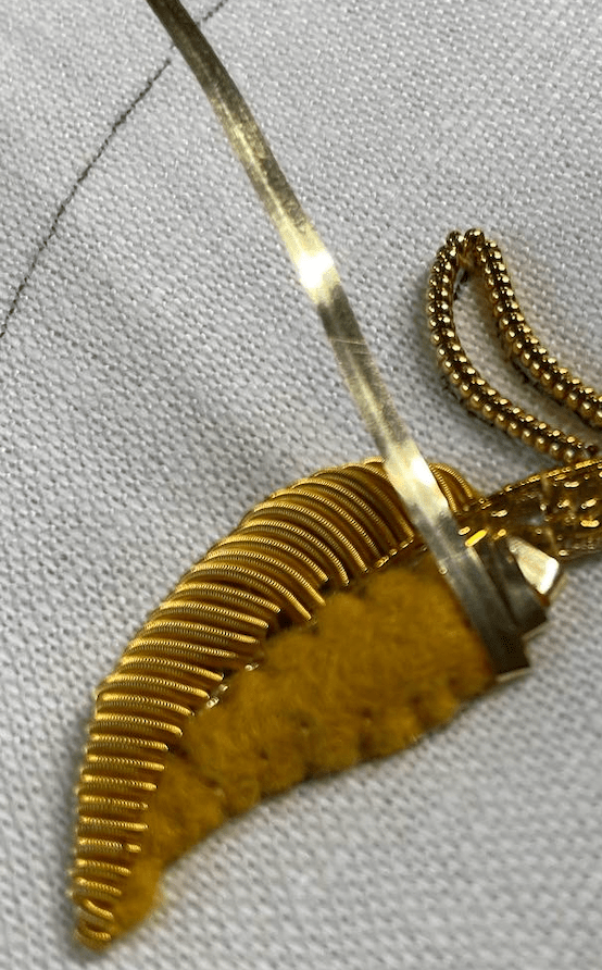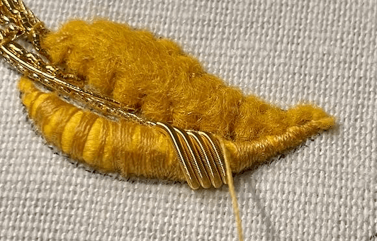 The Or Nué shading is done as the gold thread is laid onto the fabric