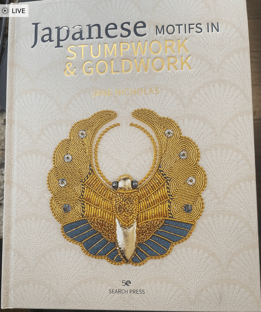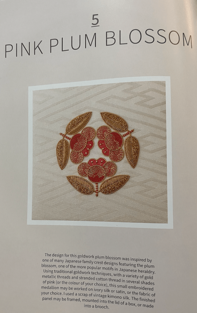 But the Japanese Plum Blossom can be seen in Jane’s new book, Japanese Motifs in Stumpwork and Goldwork. It includes the pattern, instructions, etc.