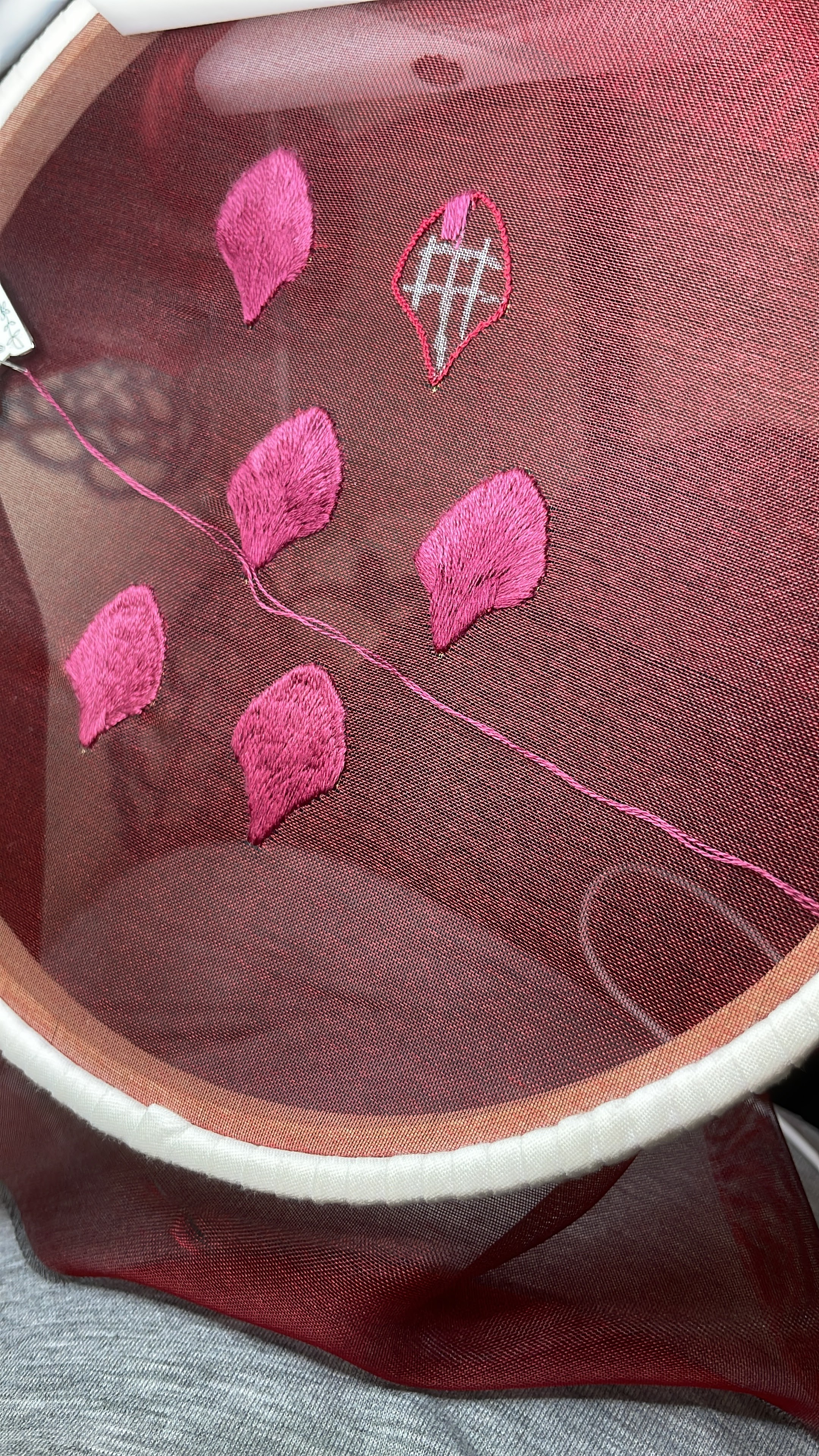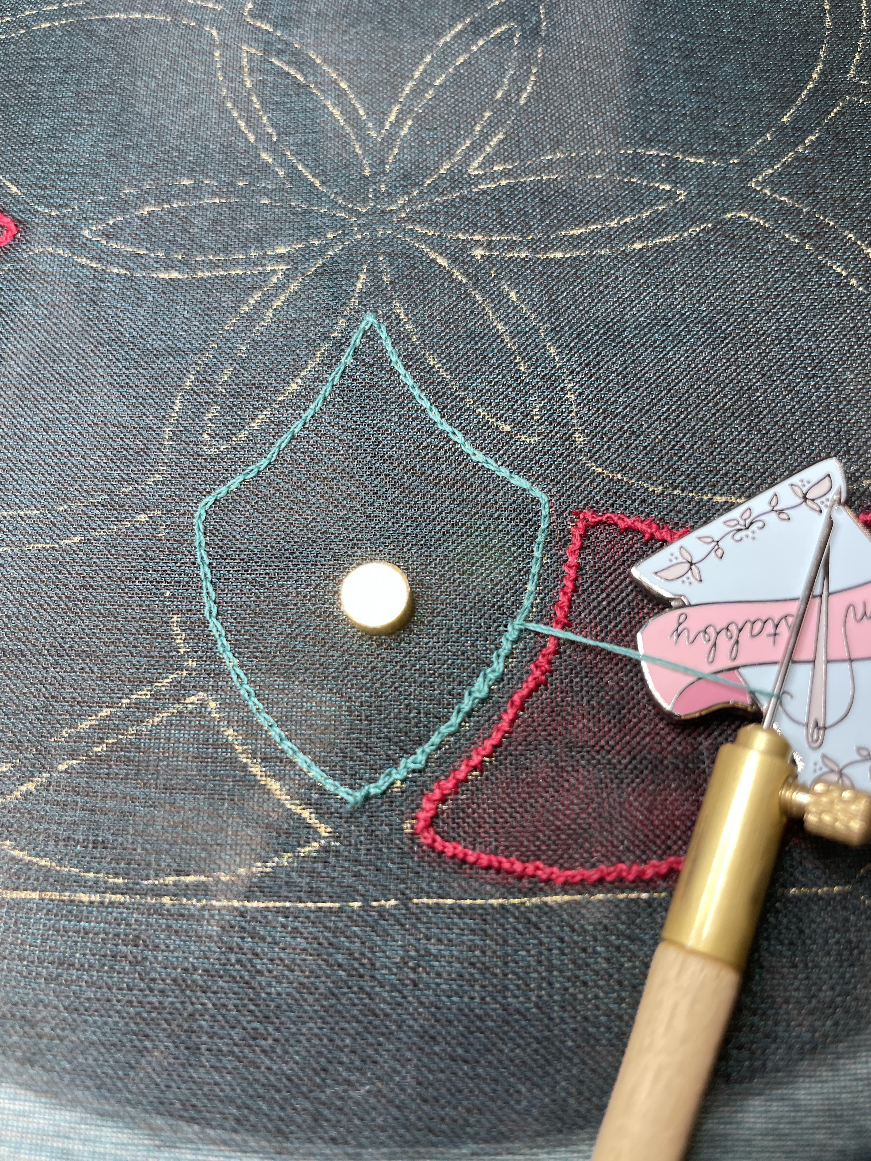 Bordé los pétalos del centro con una aguja regular usando puntada pasada. No pude hacer que las puntadas de cadeneta del ganchillo me quedaran lo suficientemente planas.