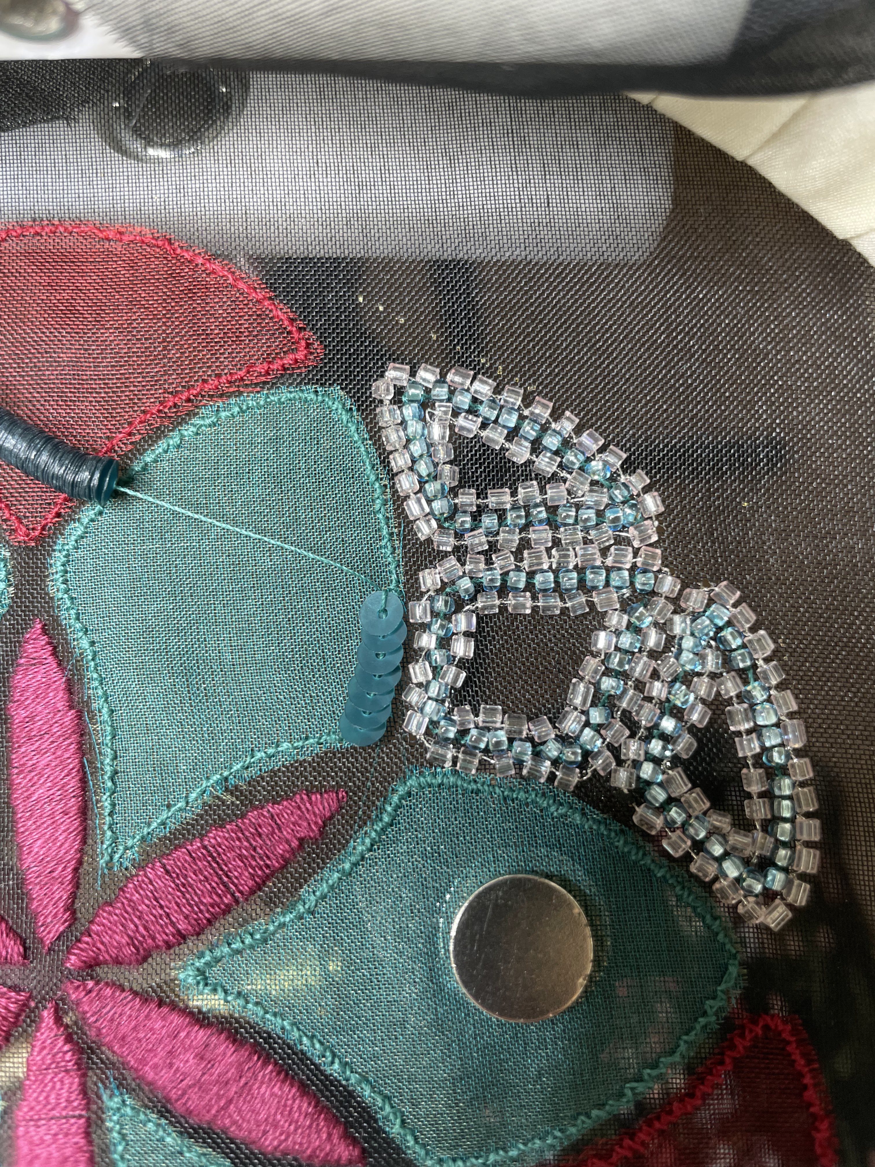 Foto del derecho de la tela. Las lentejuelas van alrededor del borde de los pétalos para cubrir la costura.