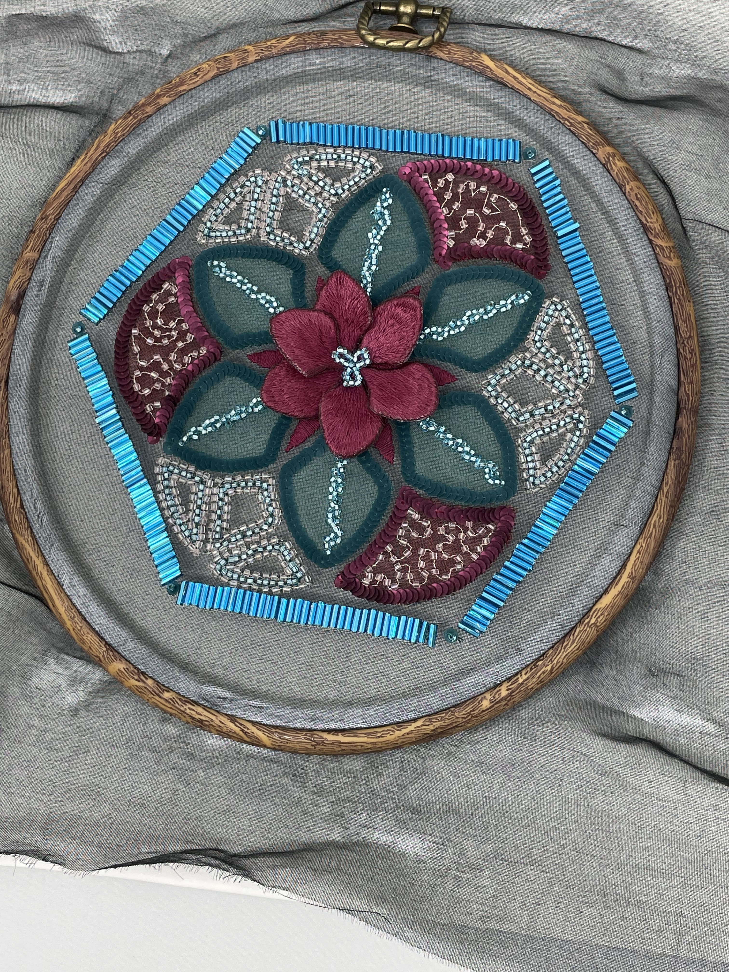 En 2021, tomé la clase de Baldosa Marroquí enseñada por Sarah Rickards, que fue parte de la escuela de verano internacional de la Real Academia Británica del Bordado (RSN Royal School of Needlework.)